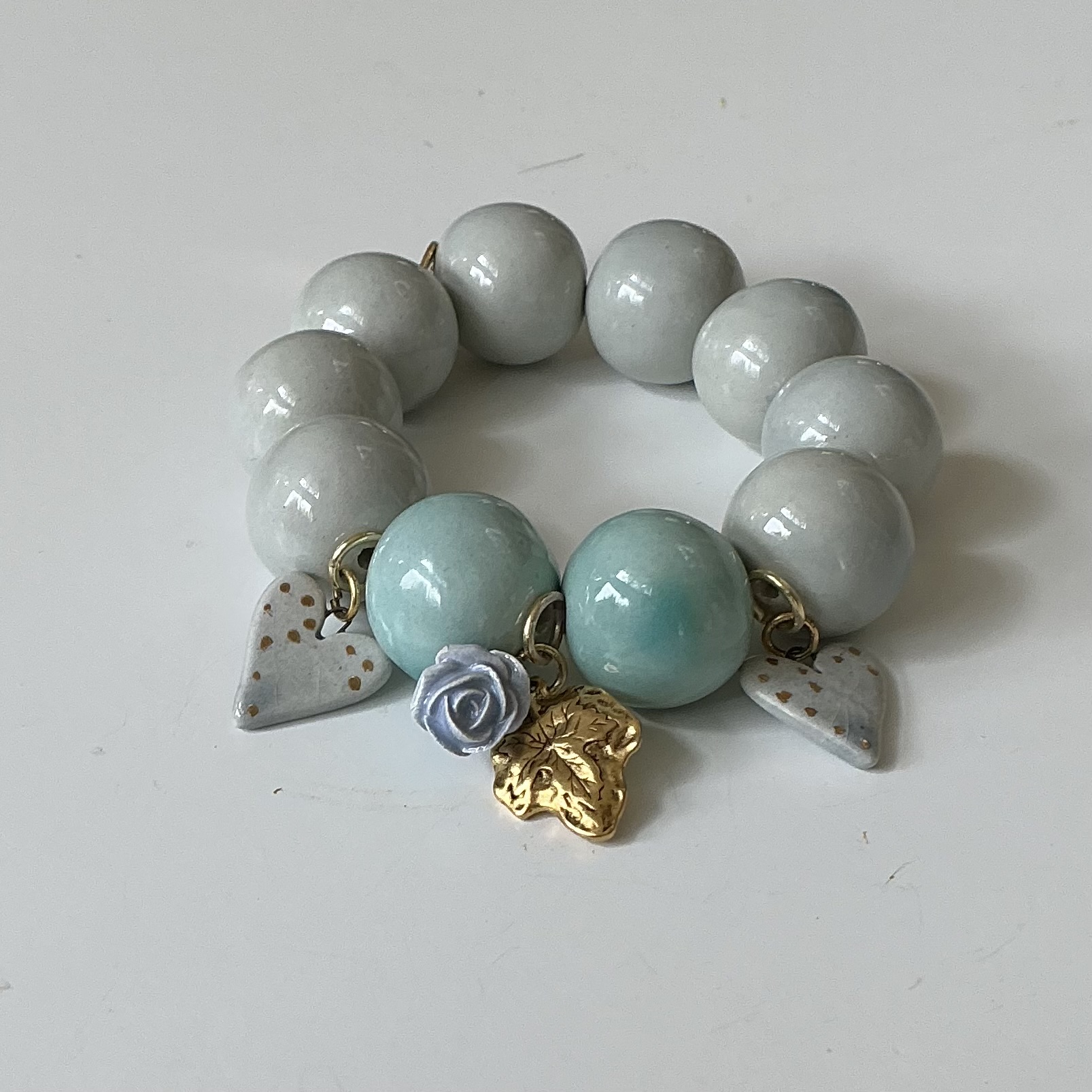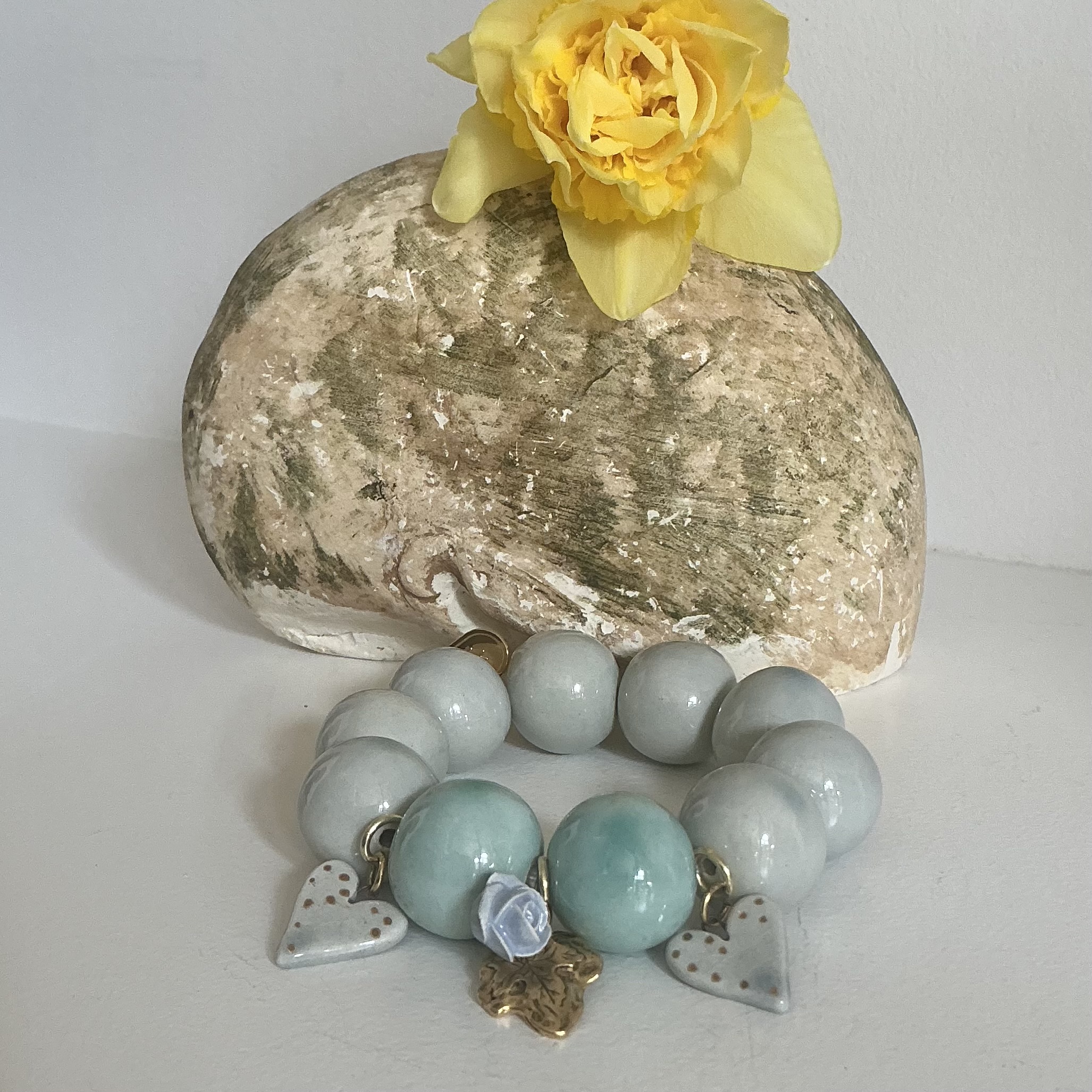 Bracelet bleu pastel , perles en céramique artisanale, façonnées et émaillées une à une , chaque perle est unique , quatre pendentifs, trois en céramique délicatement travaillé et un en étain doré l’or ornent cette pièce absolument unique .