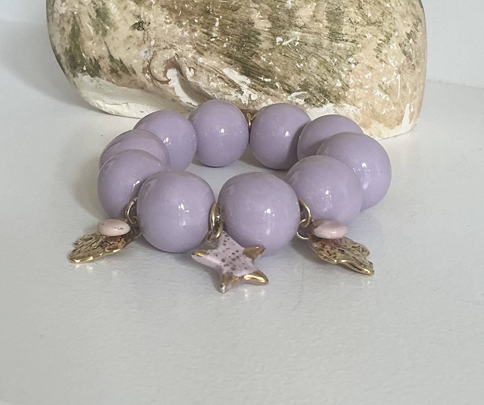 Bracelet mauve pastel , perles en céramique artisanale, façonnées et émaillées une à une , chaque perle est unique , deux pendentifs un en céramique délicatement travaillé et un en étain dorél’or ornent cette pièce absolument unique .