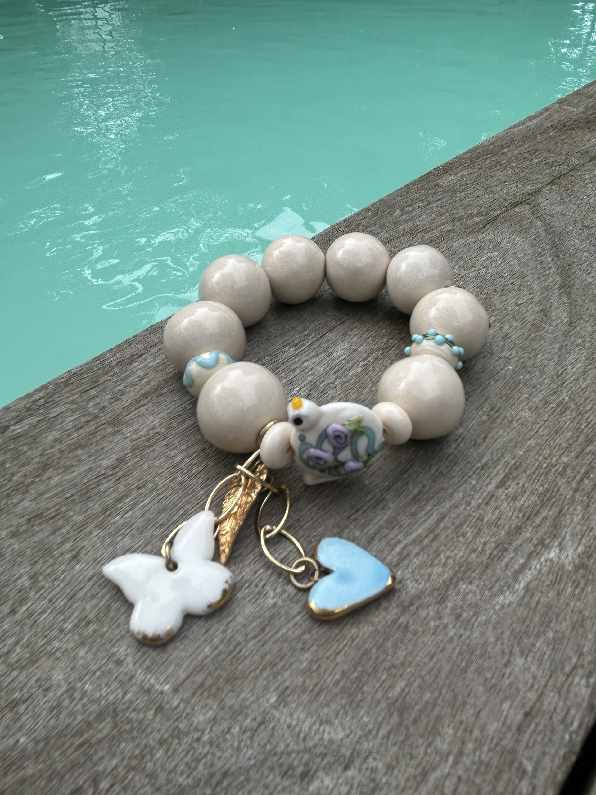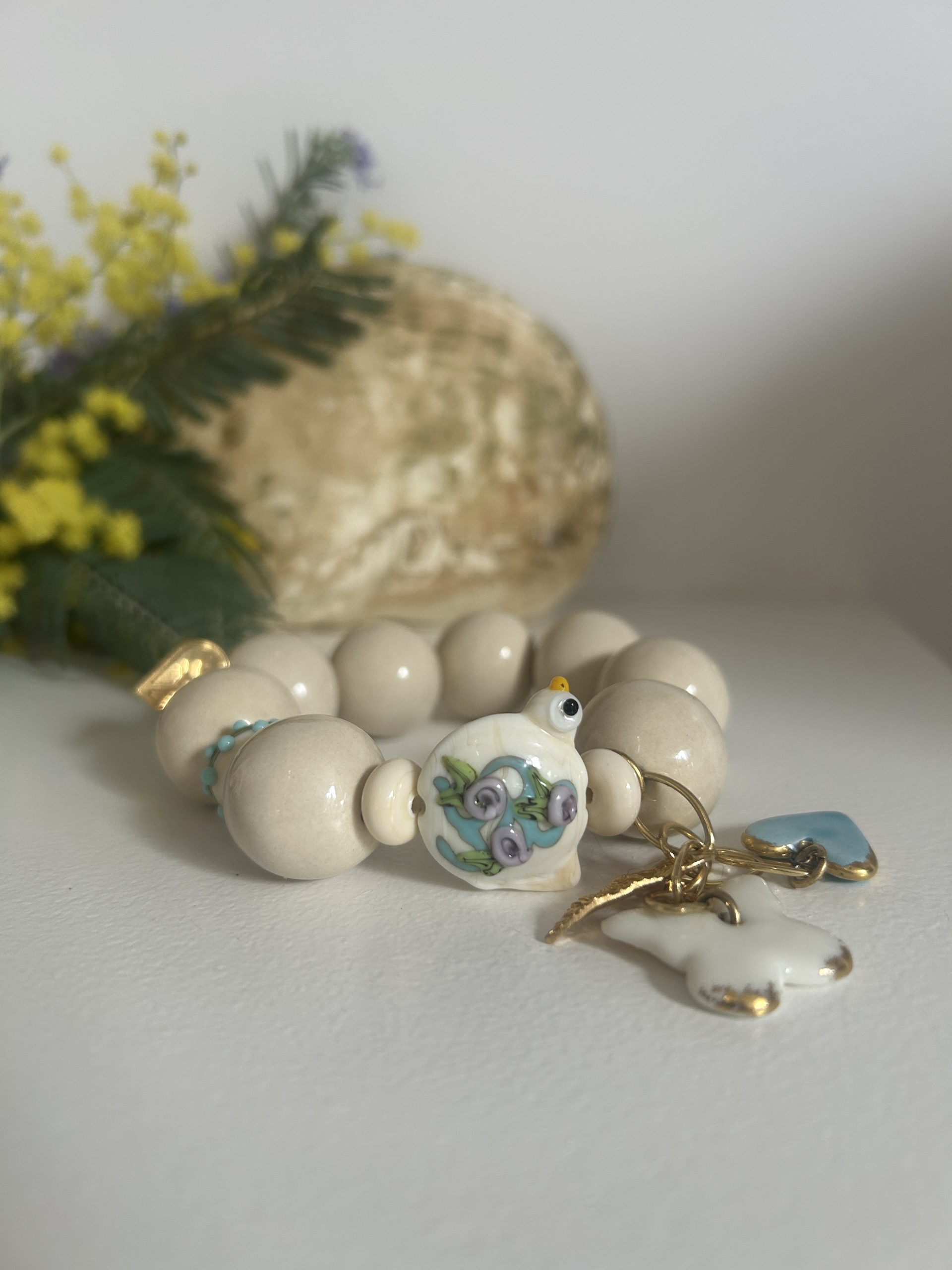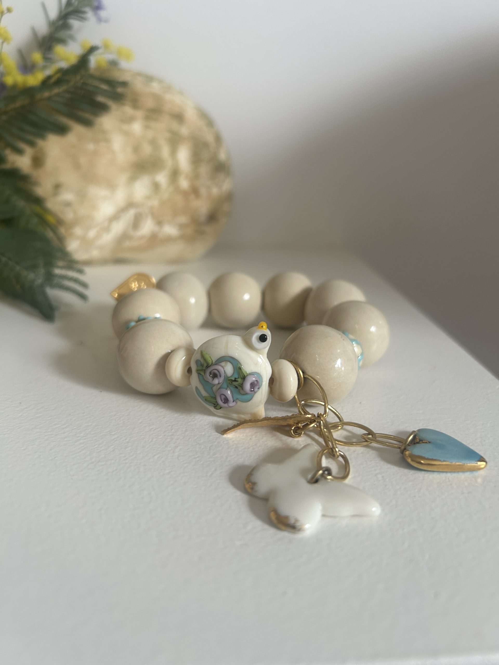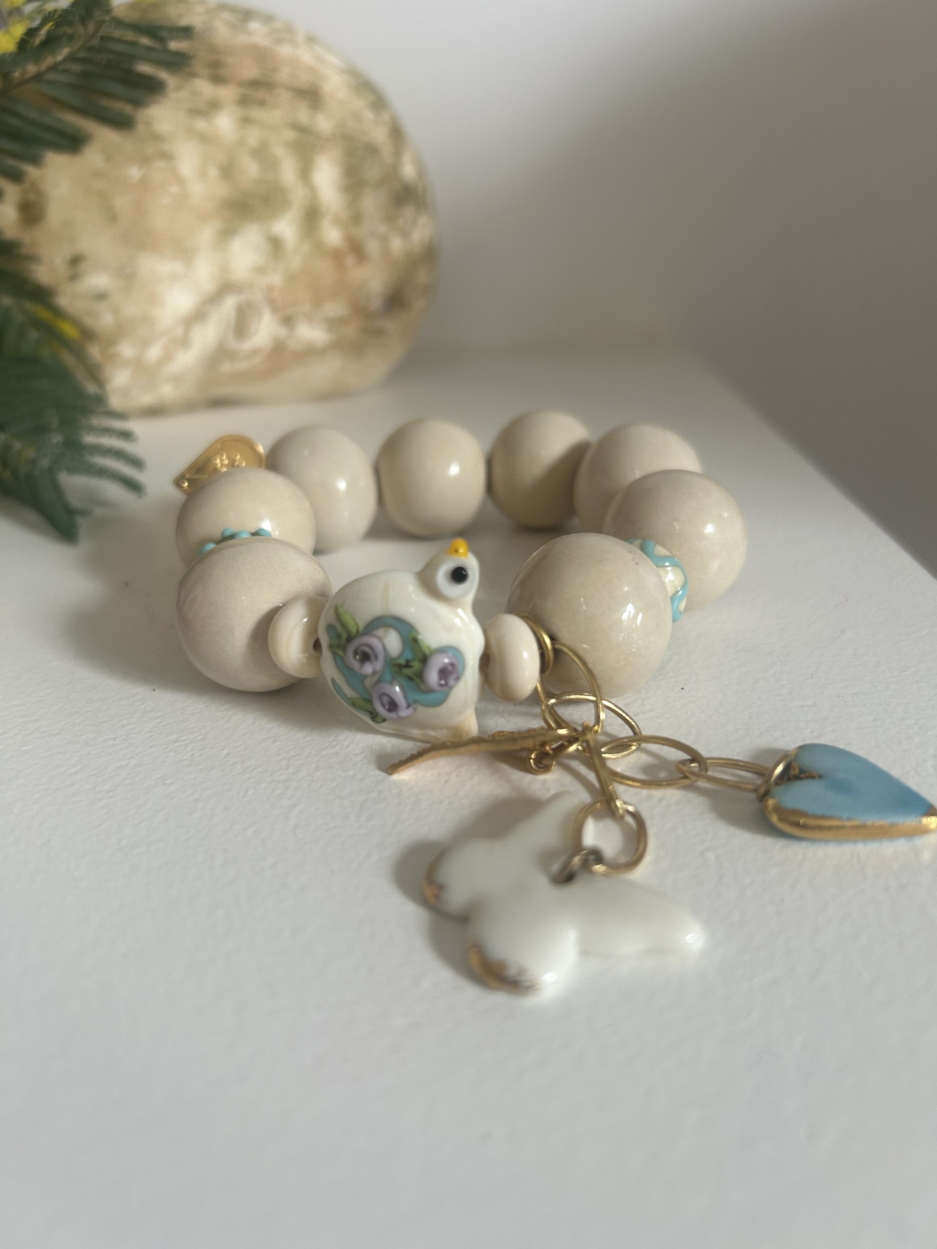 Bracelet ivoire et bleu , perles en céramique artisanale et perles en verre de Murano , délicatement travaillées . Dés une chaîne 3 microns et pendentifs en céramiques et dorés à lot fin ornent cette pièce unique et exceptionnelle.