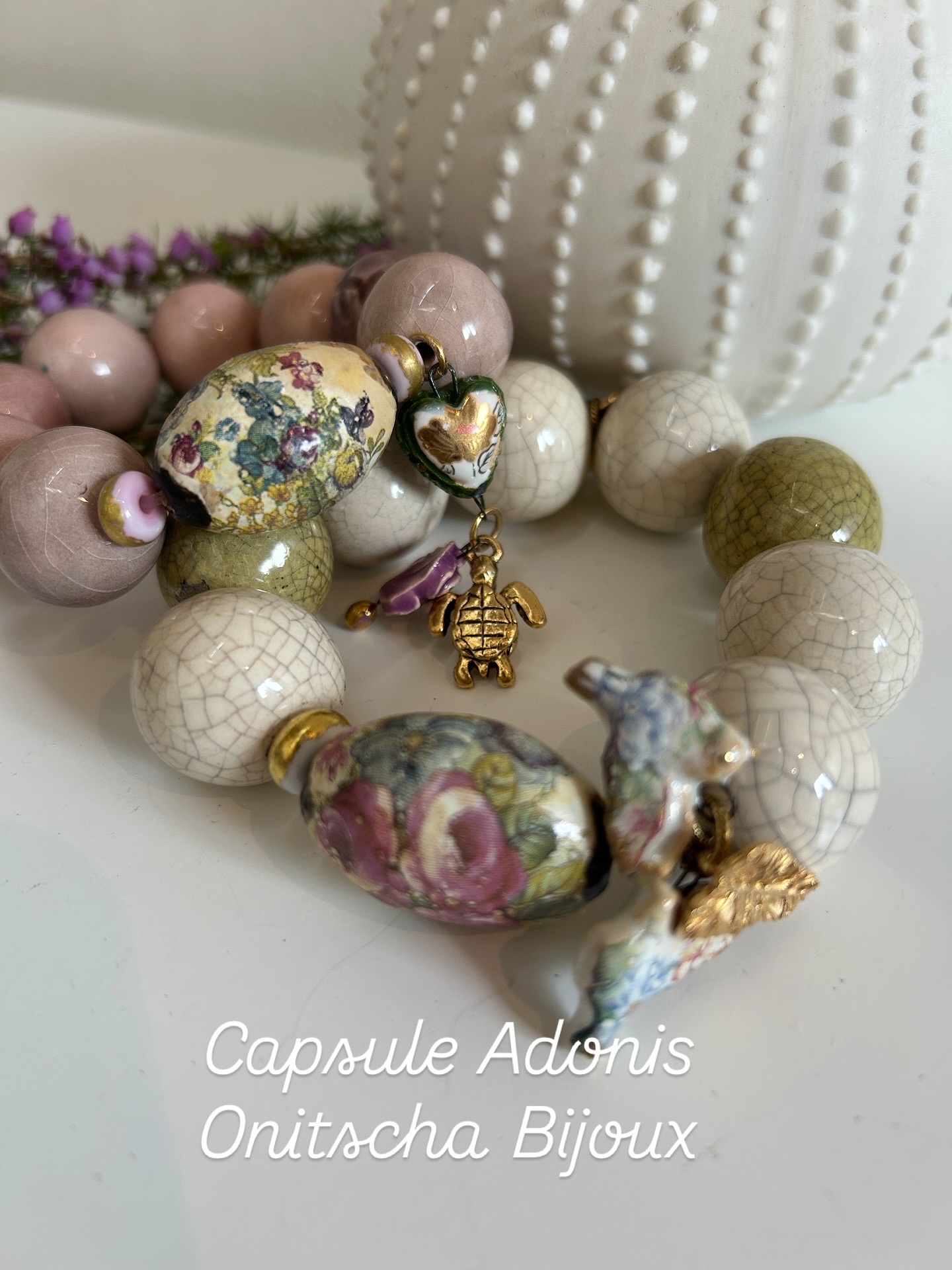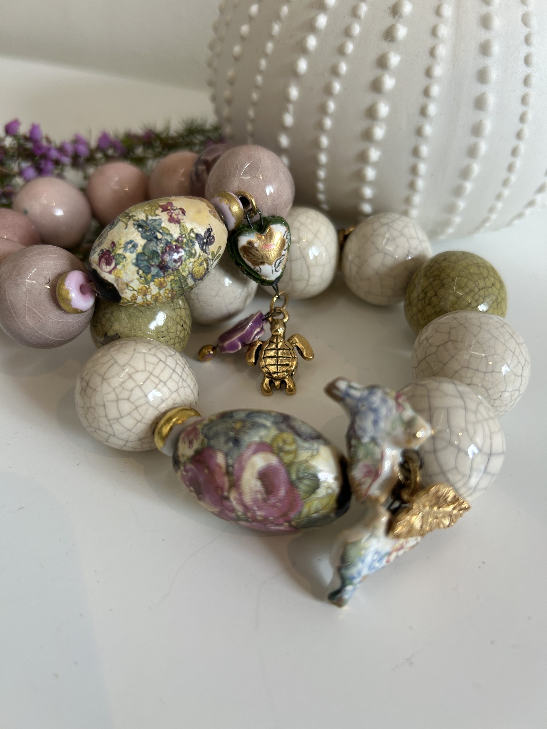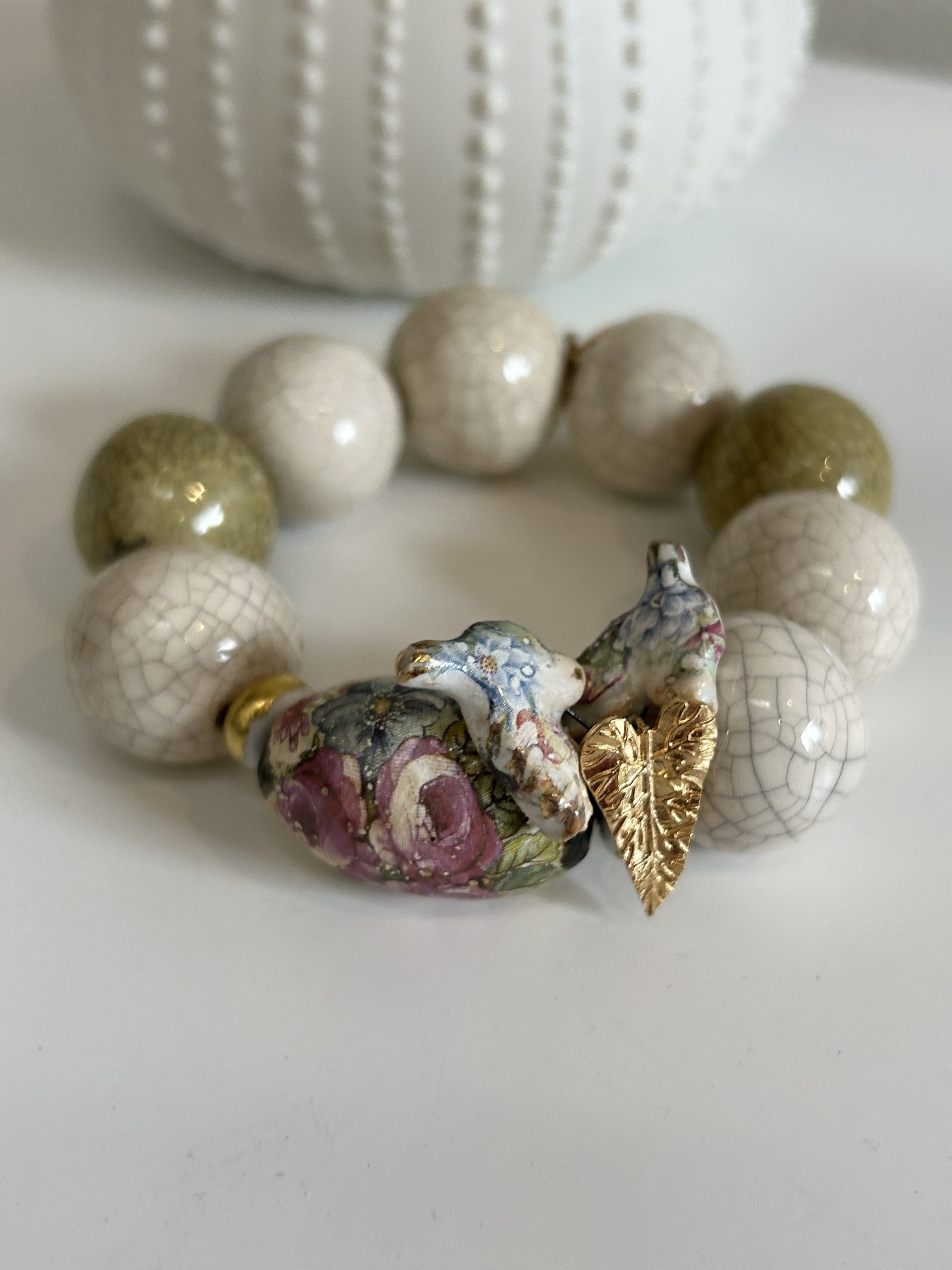 Bracelet écru et verts sauge composé de perles en céramique artisanale et d’une perle en porcelaine délicatement fleurie . Deux oiseaux en porcelaine et une feuille dorée 3 microns ornent cette pièce exceptionnelle. Édition limitée .