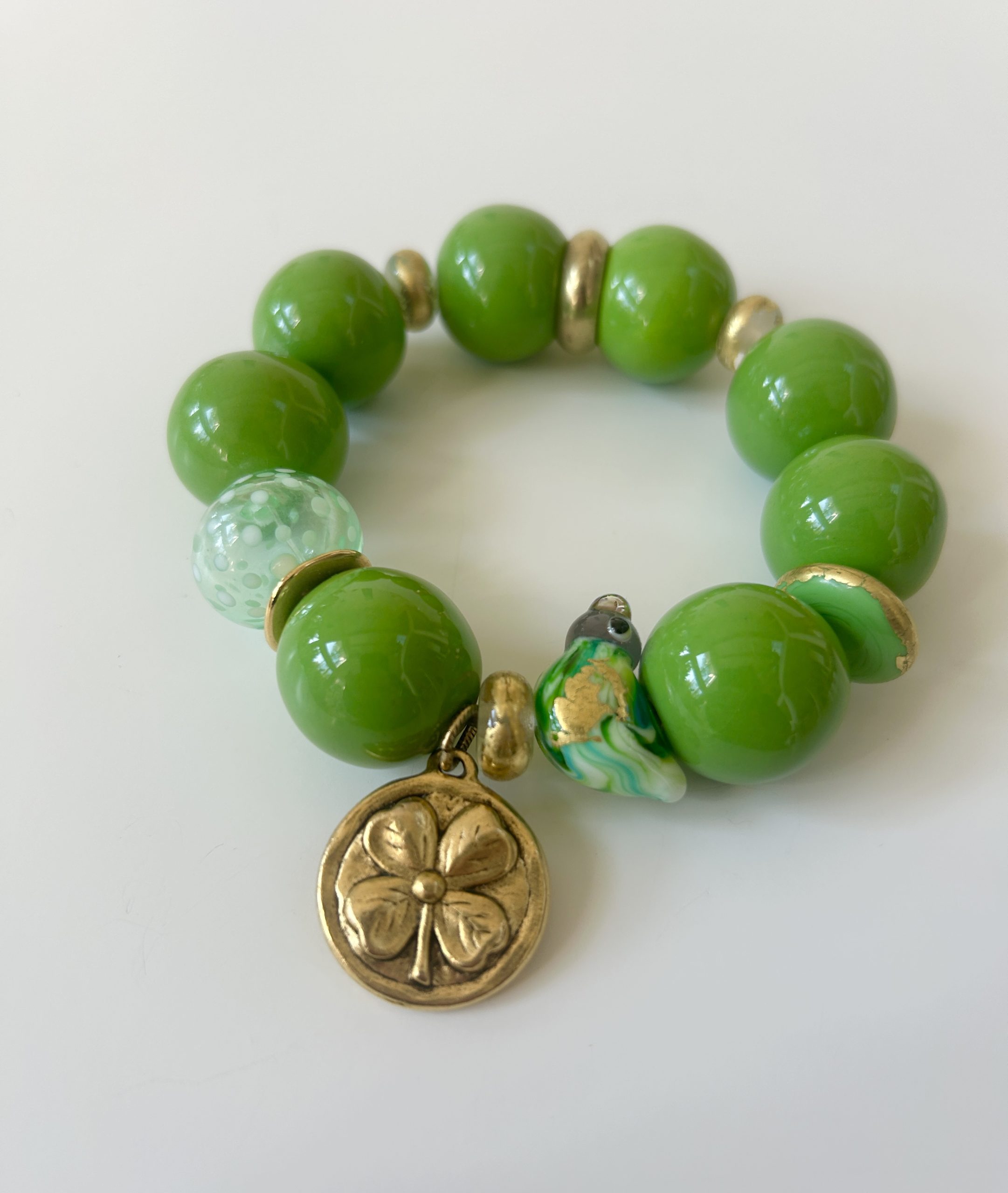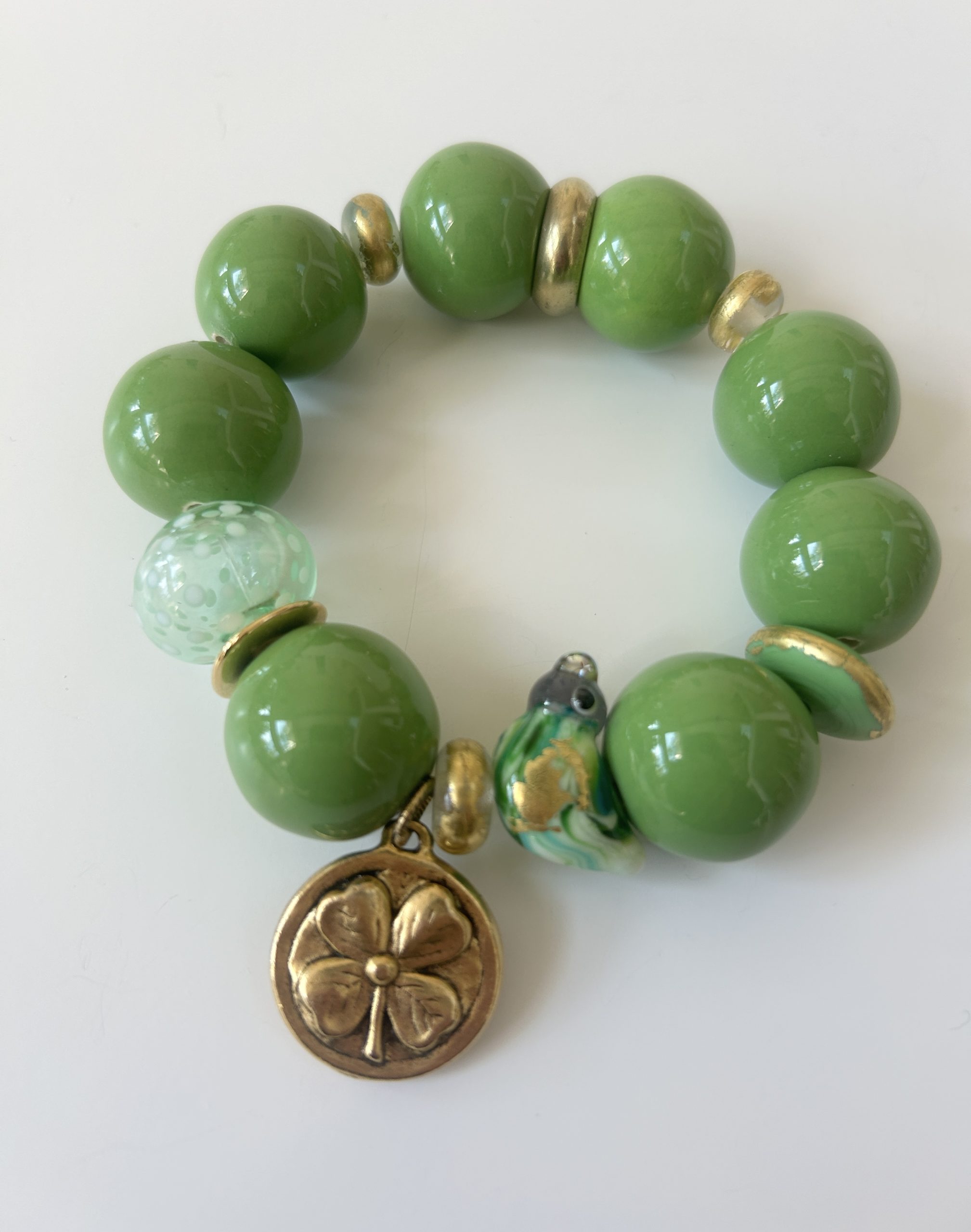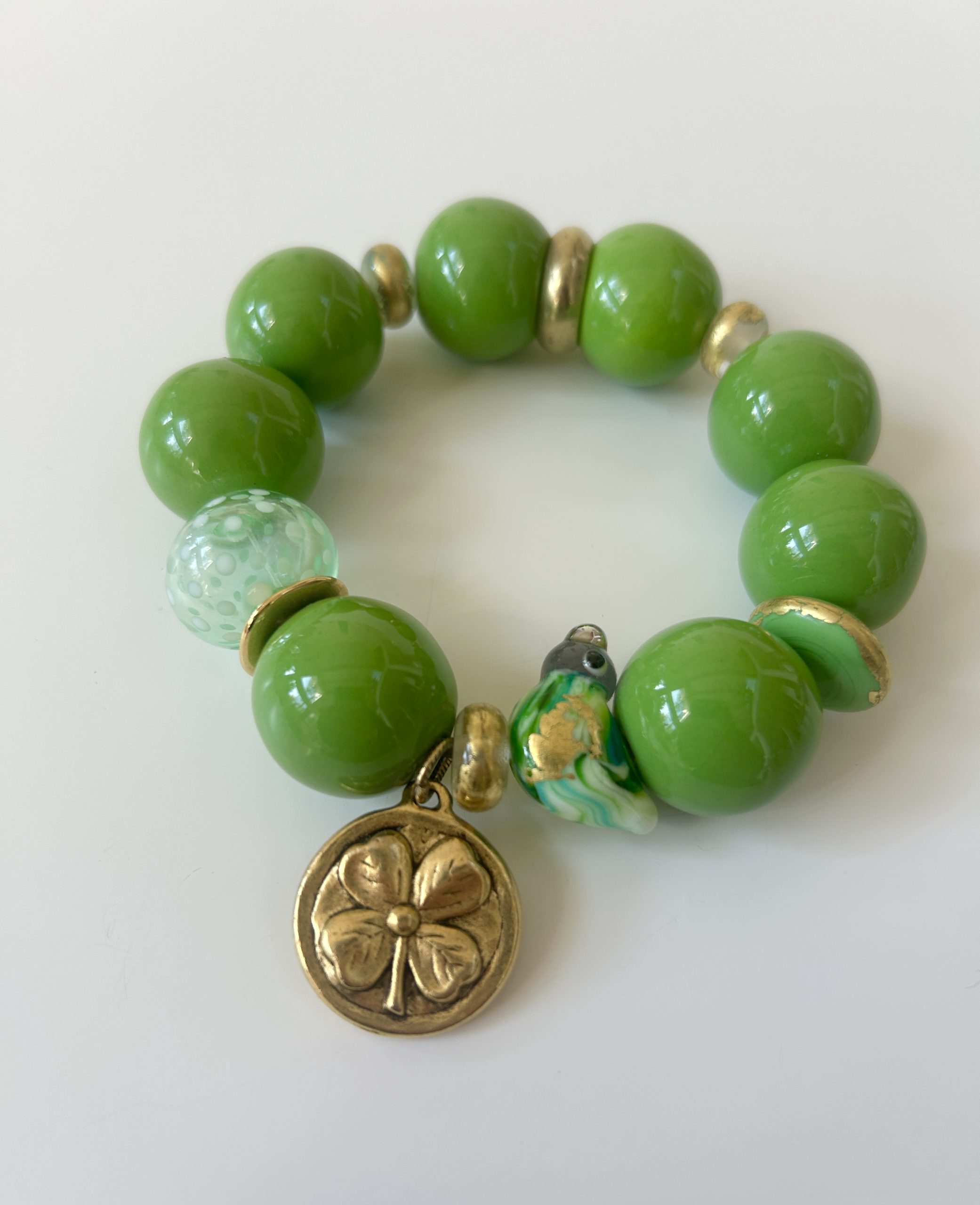 Bracelet vert pistache composé de perles en céramique artisanale et de perles en verre au chalumeau, la perle centrale représente un oiseau , il est orné de perles en verre dorées à la feuille d’or et d’une perle transparente . Un pendentif en étain doré à l’or orne cette pièce unique.