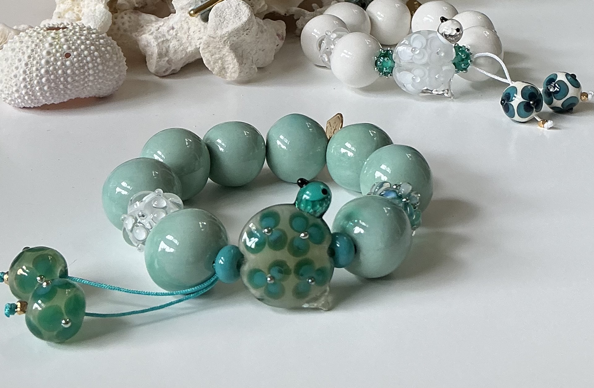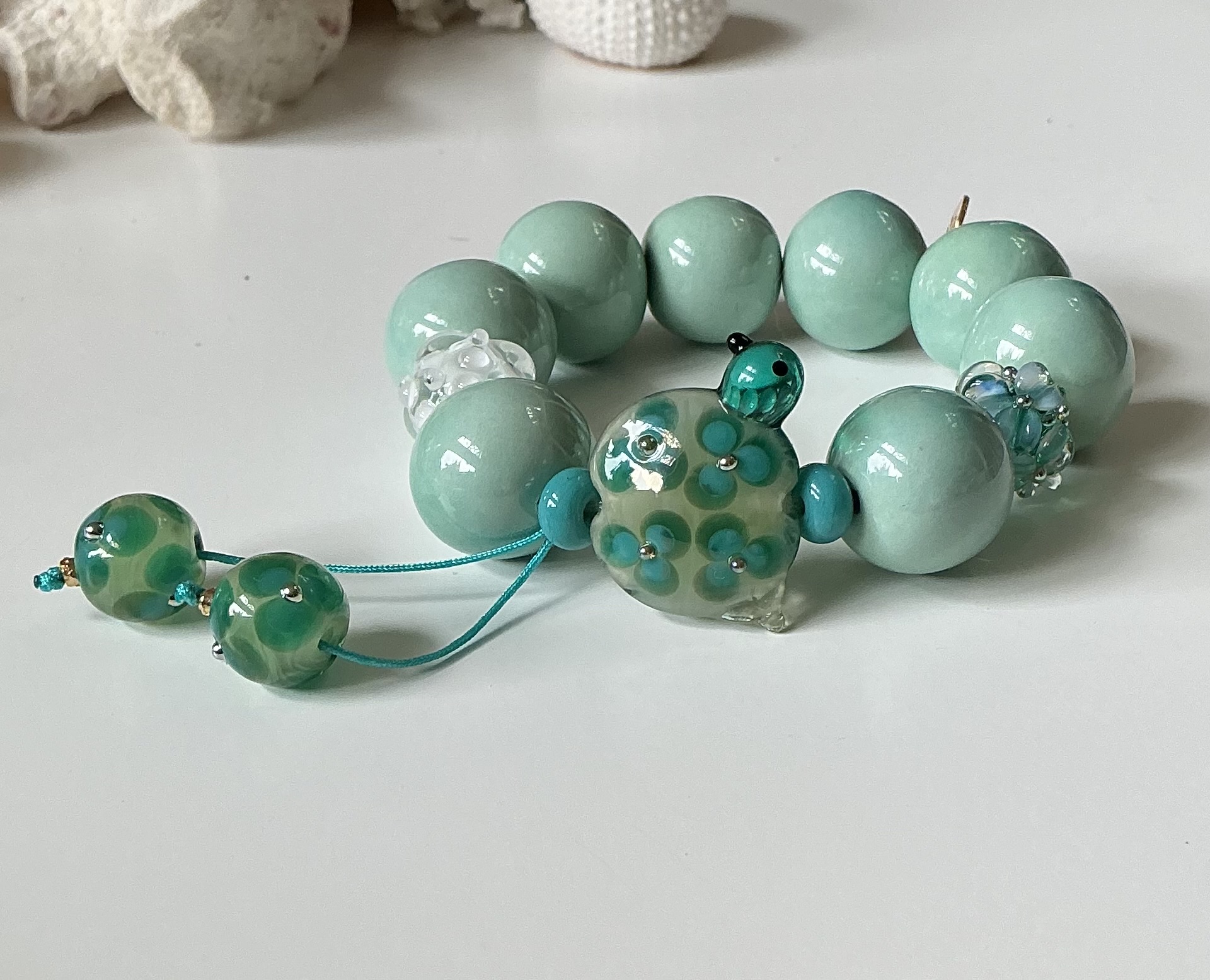 Bracelet bleu aiguë marine en perles , perles en céramique artisanale , perles en verre de Murano . Deux perles en verre ornent l’ensemble . Pièce unique .