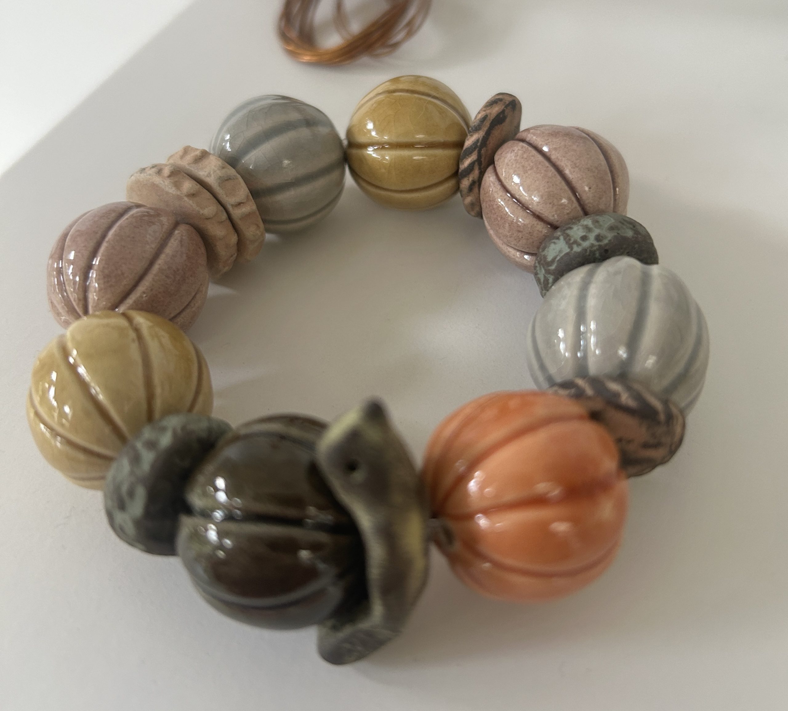 Bracelet aux couleurs automnales en céramique artisanale , mélange de perles brillantes travaillées et de perles mates.