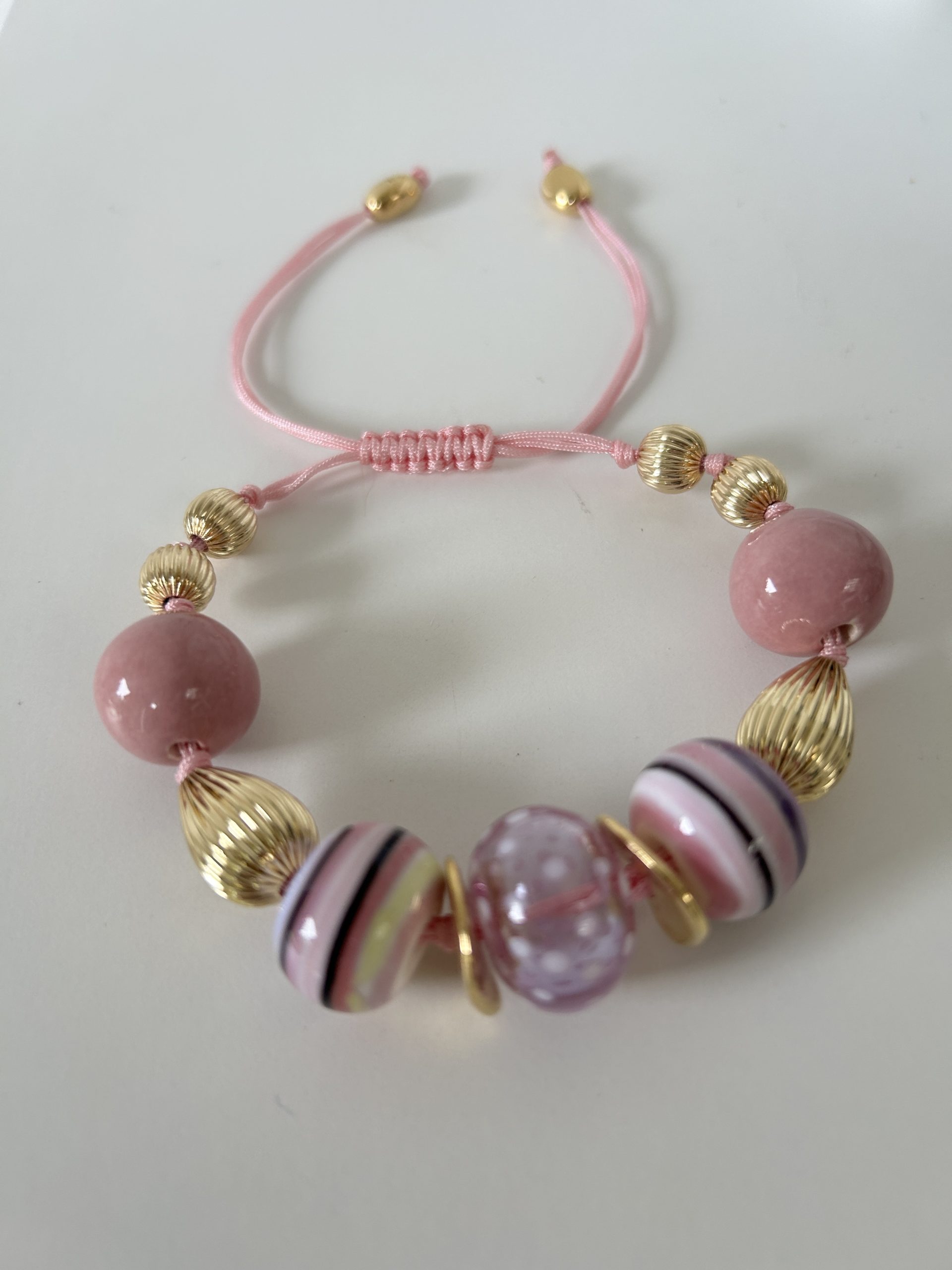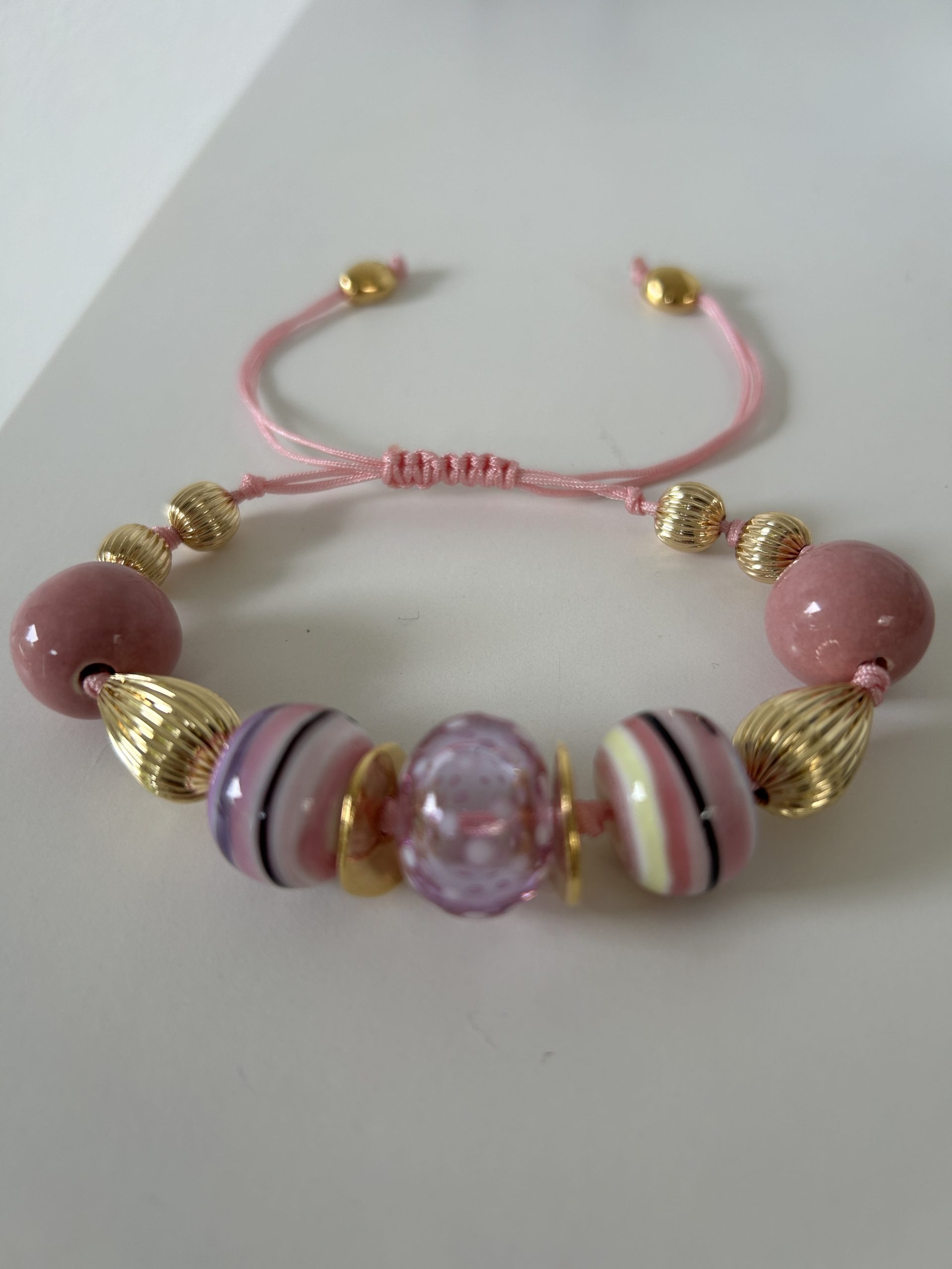 Bracelet composé de perles en céramique artisanale et de perles en verre au chalumeau , délicatement monté sur un cordon satiné , tissé à la main et terminé par des perles en plaqué or .
