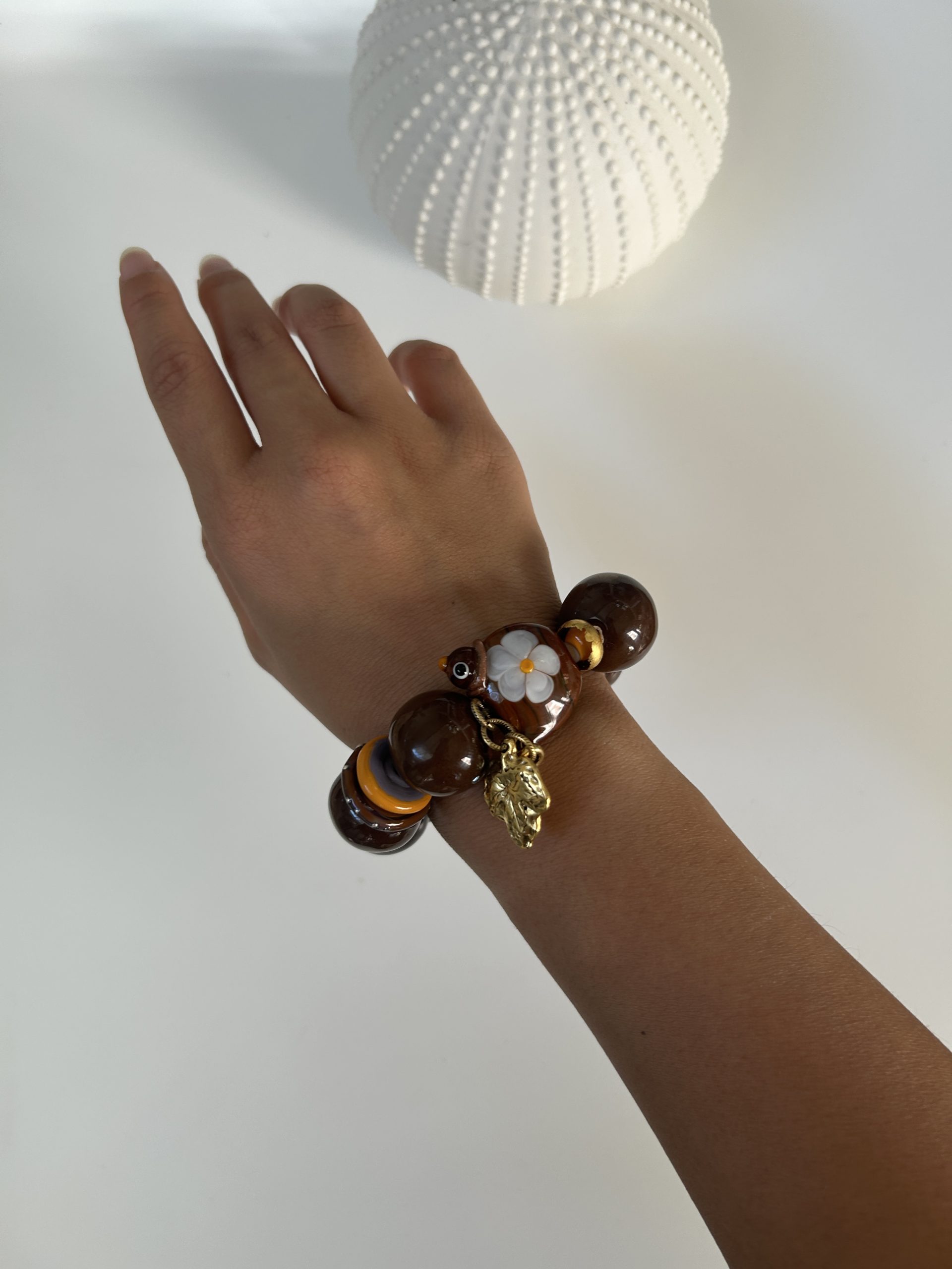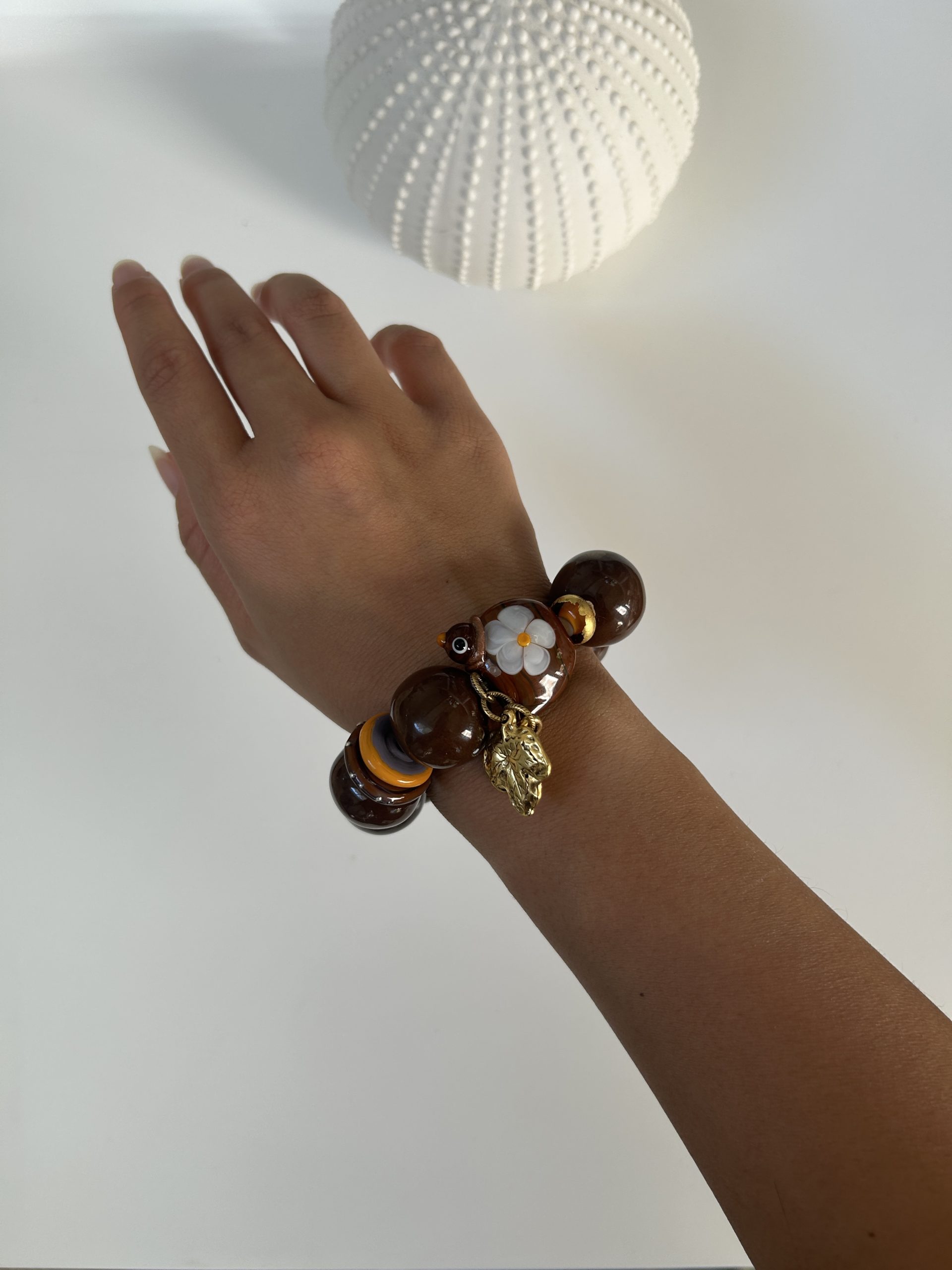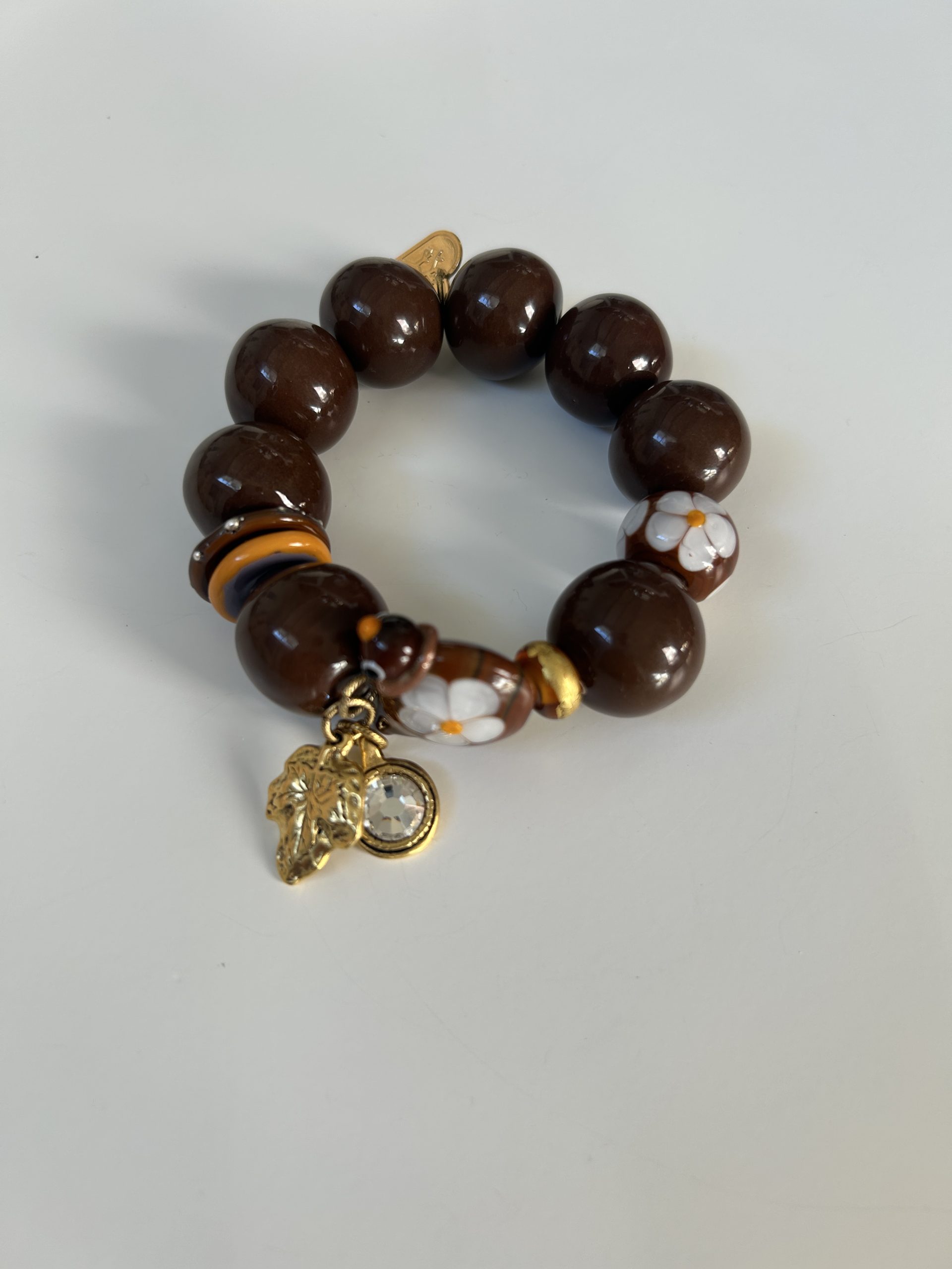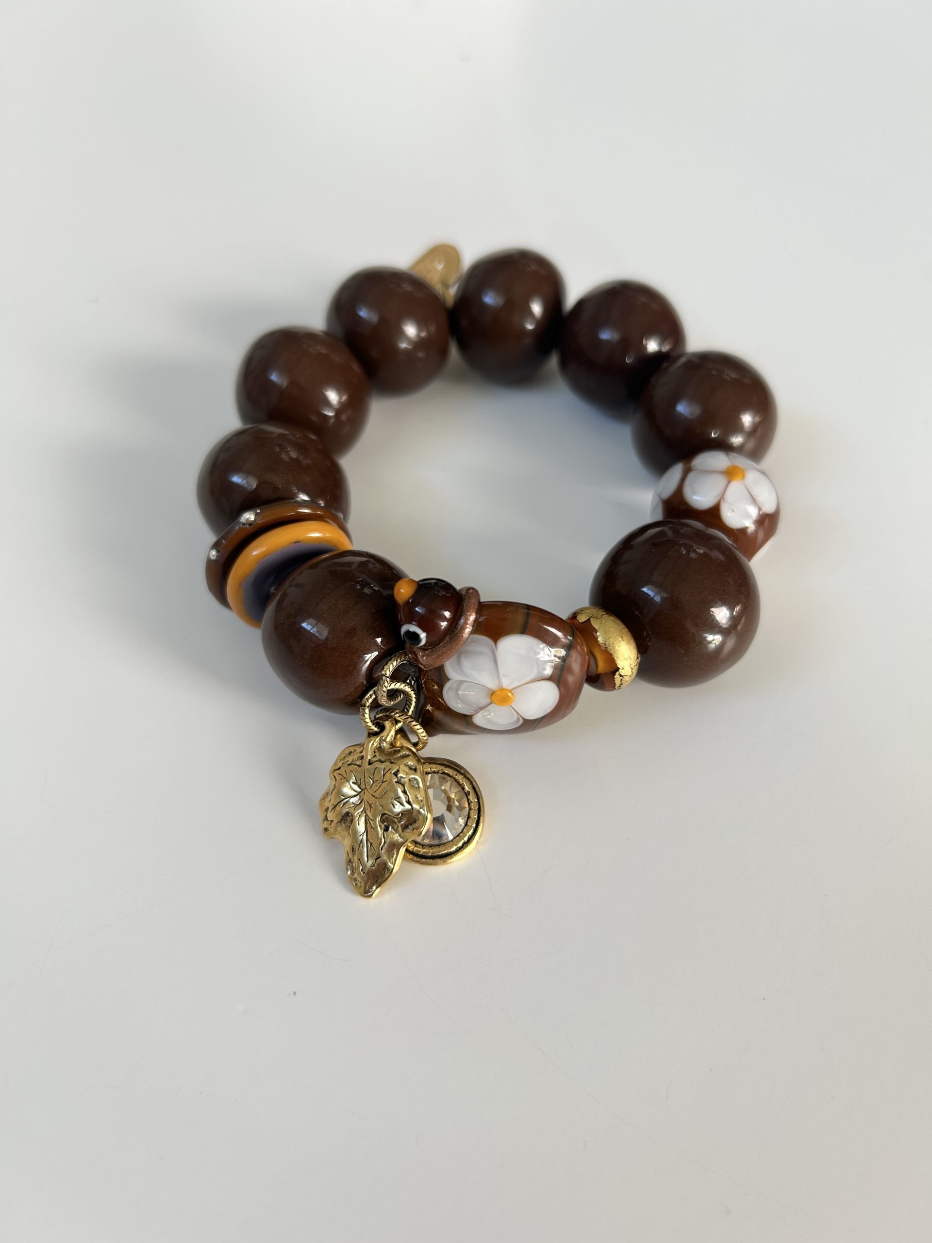 Bracelet composé de perles en céramique marron brun et de perles en verre au chalumeau.