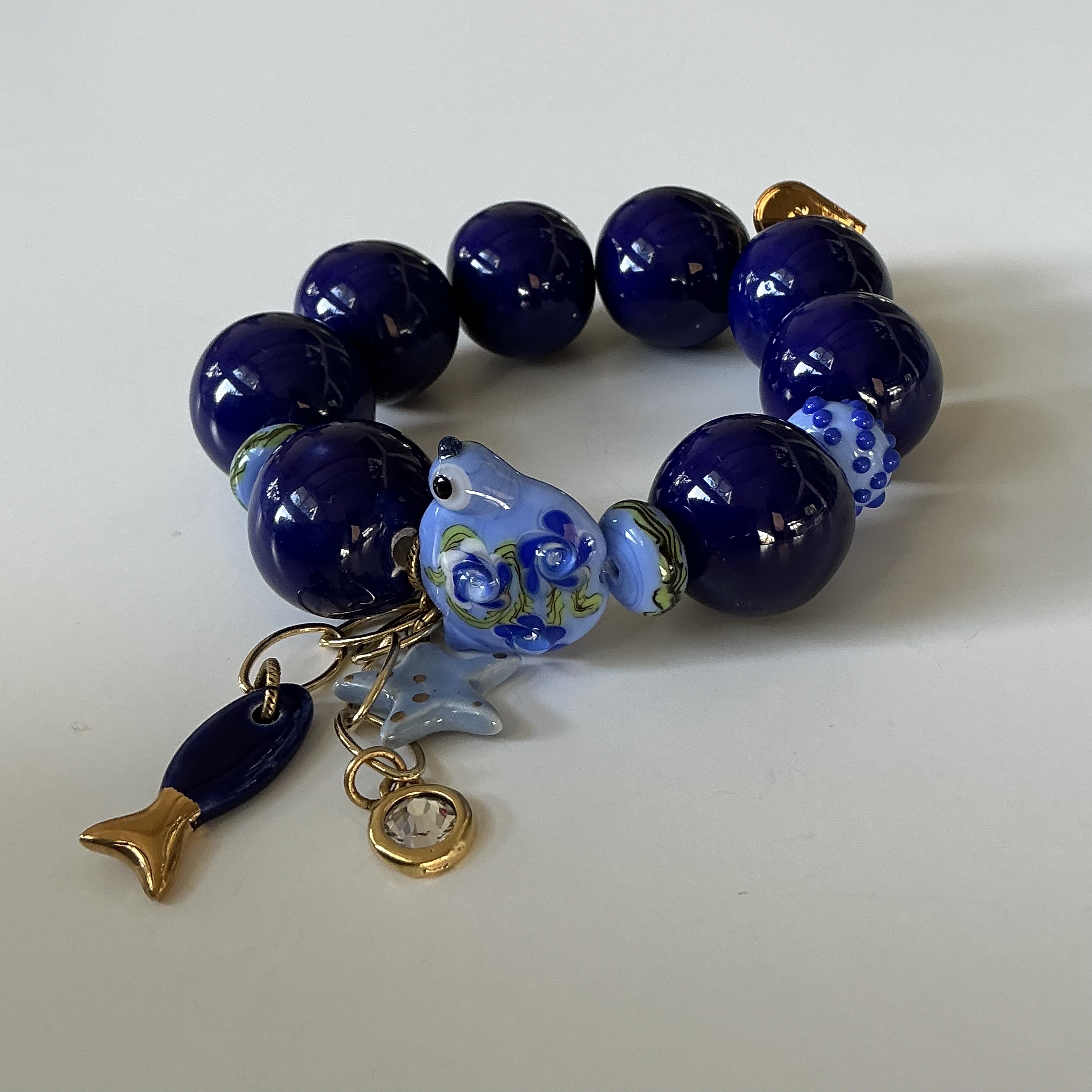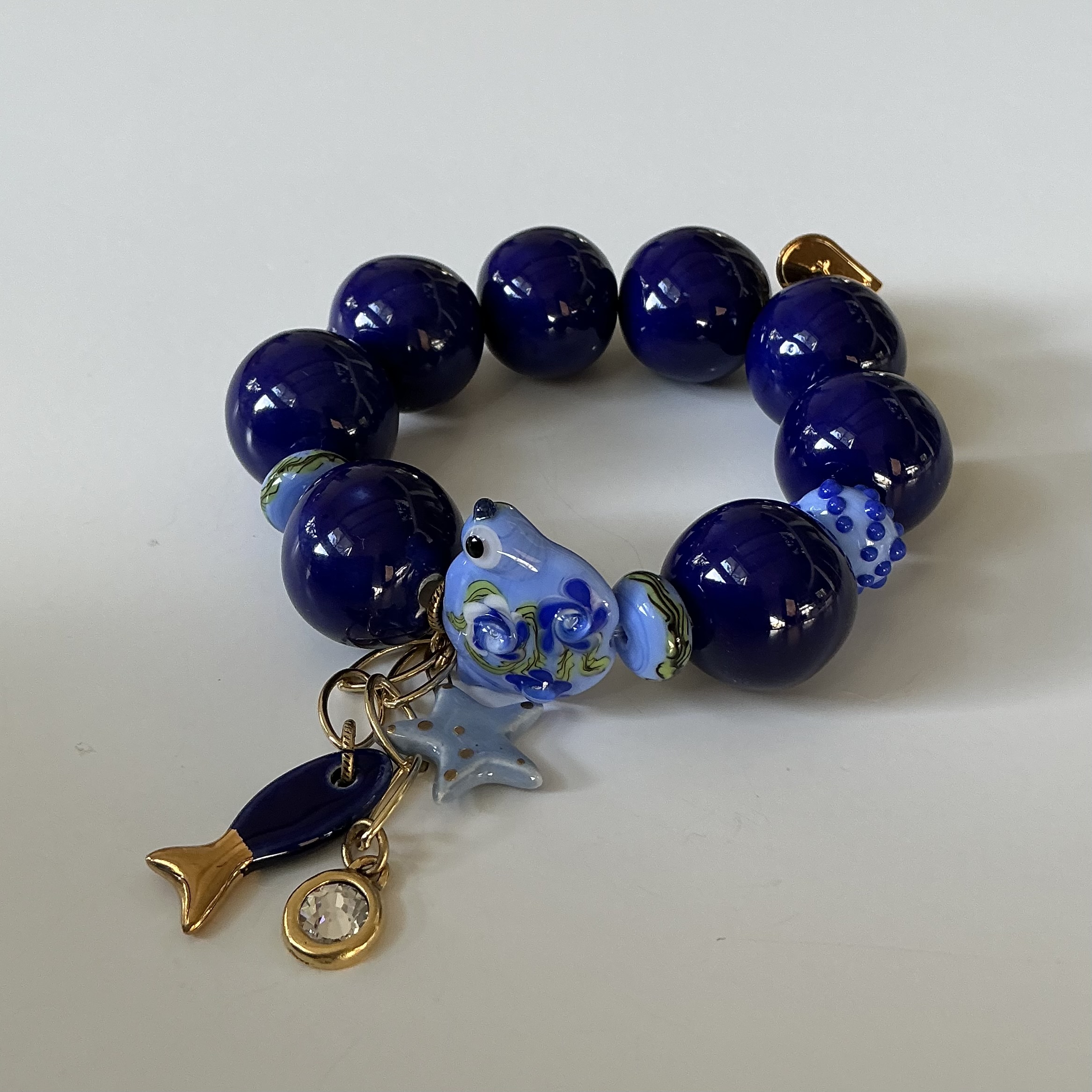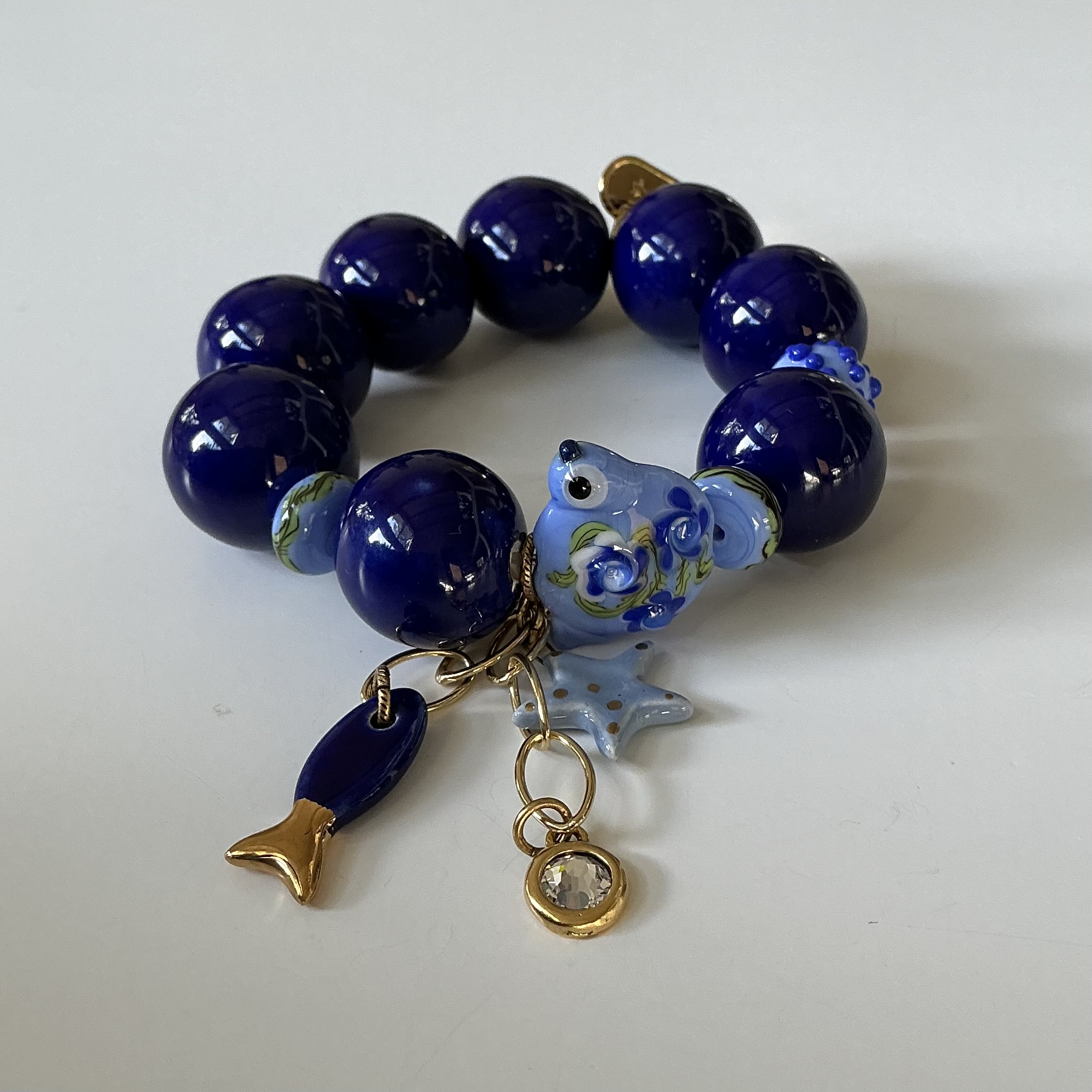 Bracelet en perles de céramique bleu et perles en verre de Murano. La perle centrale représente un oiseau. Il est orné d’une chaîne et de pendentifs en céramique et en plaqué or . Pièce unique .