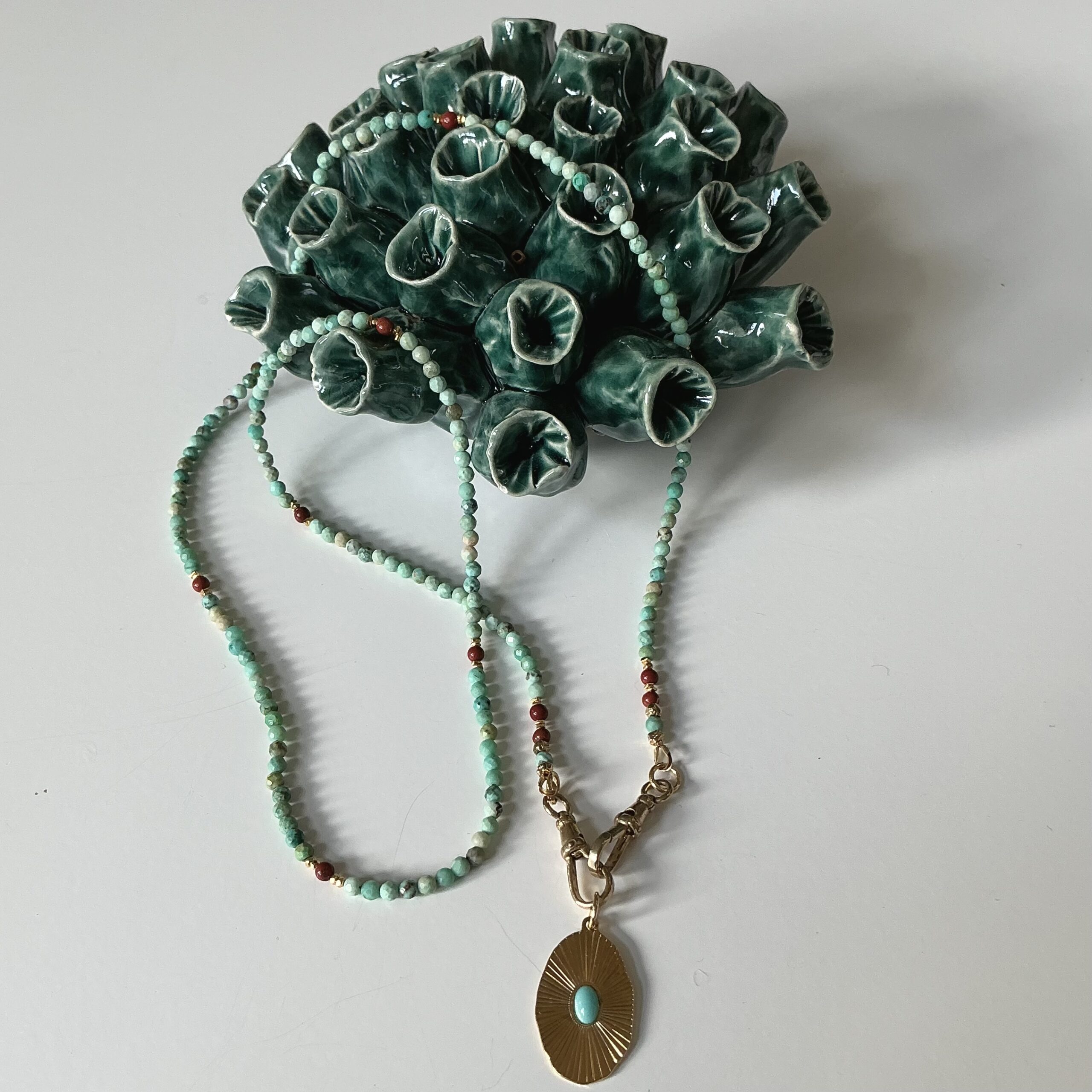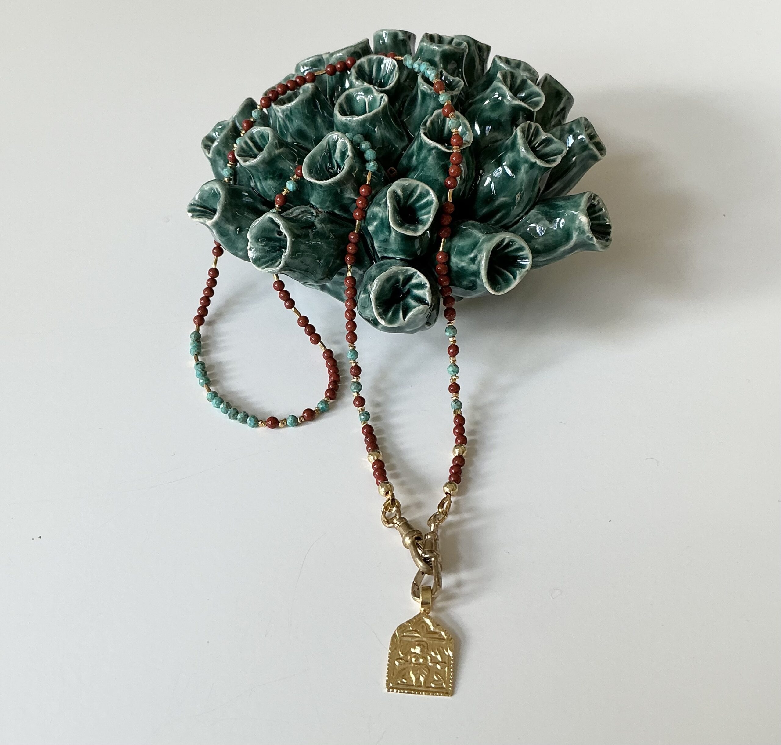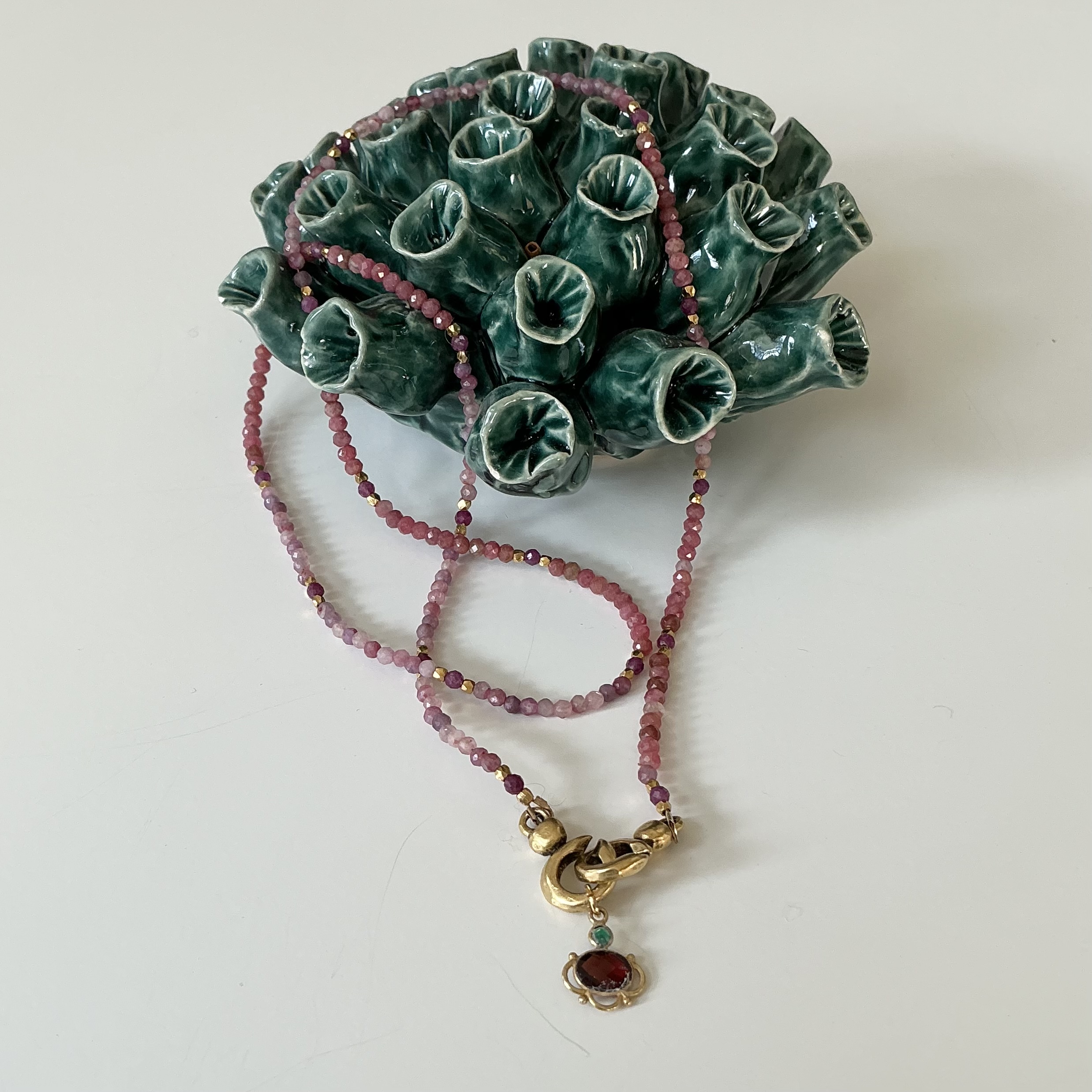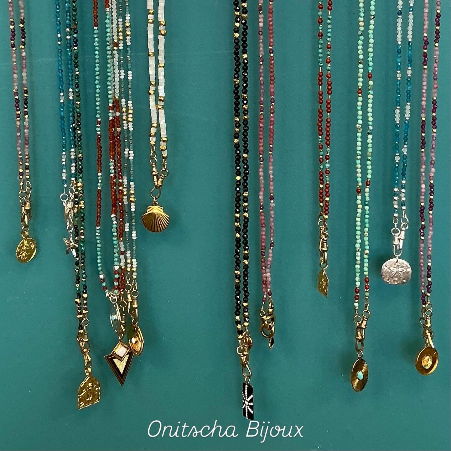 Chaque collier, d’une longueur de 60 cm, est composé de perles fines (3 mm à 4 mm) : améthyste, rubis, cornaline, tourmaline rose, turquoise, jaspe rouge, spinelle… Des nuances vibrantes qui se mêlent avec harmonie pour créer un bijou à la fois délicat et lumineux.
