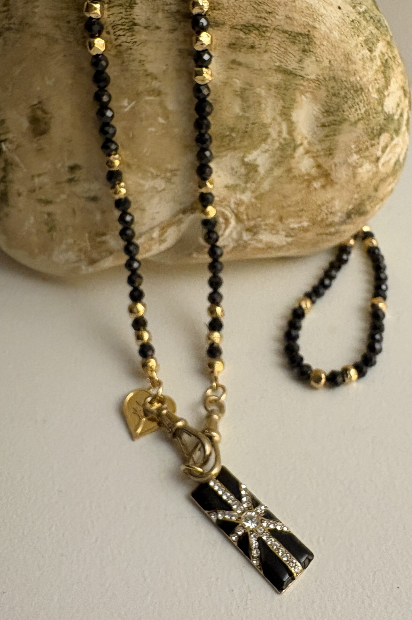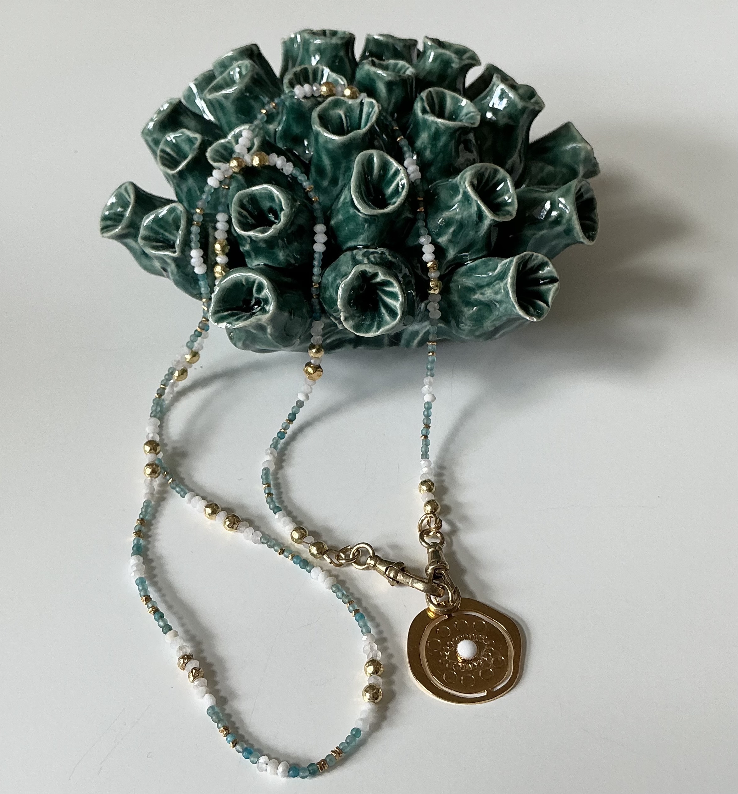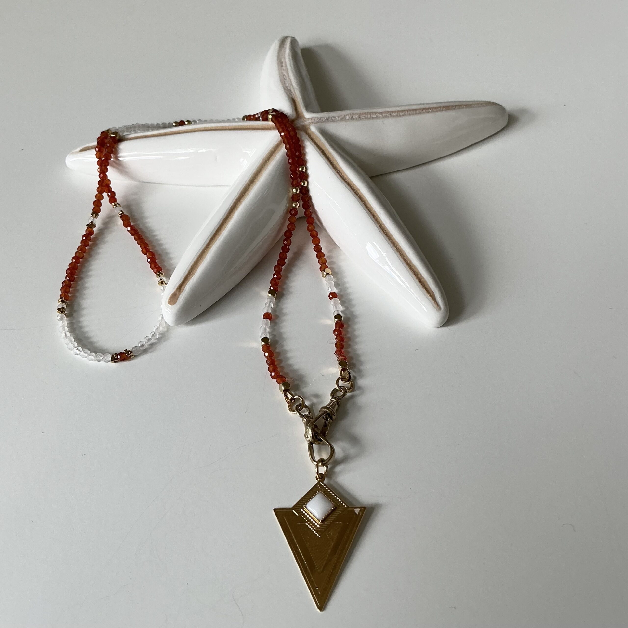 Des perles martelées en plaqué or viennent ponctuer la composition, captant la lumière et apportant du relief. Le montage, en argent massif ou étain doré à l’or, assure finesse et durabilité. Le tout est sublimé par un fermoir mousqueton allongé et un pendentif audacieux, signature forte de la collection.